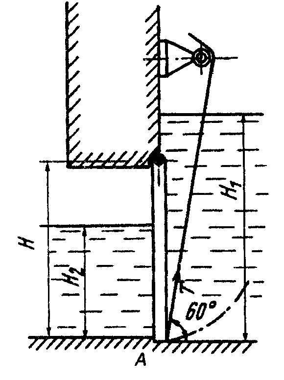 Прямоугольный поворотный щит шириной В= 4 м и высотой Н=3,5 м закрывает выпускное отверстие плотины. Справа от щита уровень воды Н1=4,8 м слева Н2=2,0 м, плотность воды ρ=1000 кг/м3. 1. Определить начальную силу Т натяжения троса, необходимую для открытия щита, если пренебречь трением в цапфах. 2. С какой силой Р щит прижимается к порогу А в закрытом положении, если принять, что по боковым сторонам щита опоры отсутствуют? 3. Построить результирующую эпюру гидростатического давления на щит, предварительно построив эпюры давления на щит слева и справа.