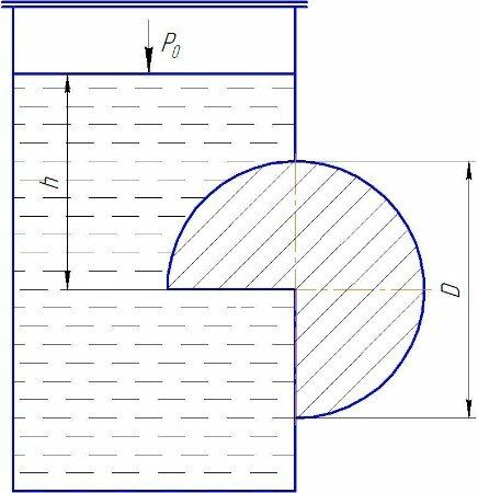 В прямоугольном отверстии вертикальной стенки резервуара установлен на цапфах цилиндрический затвор диаметром D и длиной B. Определить вертикальную и горизонтальную составляющие силы, действующей на цапфы. Давление на поверхности жидкости Ро. Плотность жидкости ρ. Дано: D=1,8 м; B=1,73 м; Ро=1,17 кПа; h=1,2 м; ρ=1000 кг/м3.
