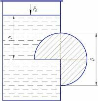 Главная » Учебные материалы » Механика жидкости и газа (МЖГ или Гидравлика) » Решения задач » Несколько классов/семестров » В прямоугольном отверстии вертикальной стенки резервуара установлен на цапфах цилиндрический затвор диаметром D и длиной B. Определить вертикальную и горизонтальную составляющие силы, действующей на цапфы. Давление на поверхности жидкости Ро. Плотнос