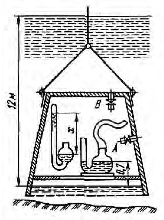 Каково показание x ртутного барометра, помещенного в водолазном колоколе, если поверхность воды (ρ = 1025 кг/м3) в колоколе на H = 12 м ниже уровня моря, а показания барометра на поверхности моря 750 мм.рт.ст.? Как установится ртуть в манометре с «постоянным » нулем, если манометр присоединить к крану А колокола? Как она установится, если манометр присоединить к крану B? Считать, что при измерениях воздух в соединительной трубке, ведущей к чашке прибора, отсутствует.