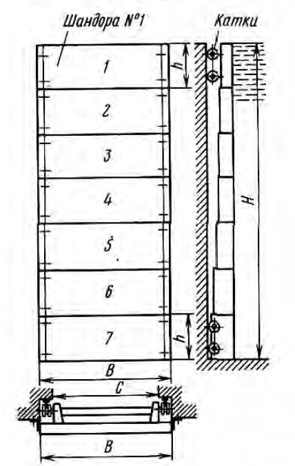 В плотине сделан прямоугольный проем размером H x C, через который вода поступает к турбине.nПри ремонте турбины этот проем закладывается семью специальными балками-шандорами. Размер каждой шандоры h x B = 1,2 x 3,4 м2. Все шандоры имеют по две пары катков.n1. Определить силы давления воды P1 и P7 на первую и седьмую шандоры и величины максимальных изгибающих моментов M1 и M7 для этих шандор, считая катки расположенными на концах шандор. 2. Найти расстояния Δh1 и Δh7 между центром давления и центром тяжести смоченной поверхности первой и седьмой шандор.