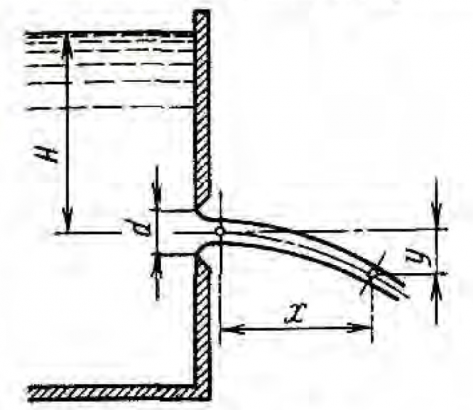 Определить коэффициенты расхода, скорости, сжатия и сопротивления при истечении воды в атмосферу через отверстие диаметром d = 10 мм под напором H = 2 м, если расход Q = 0,294 л/с, а координаты центра одного из сечений струи x = 3 м и y = 1,2 м.