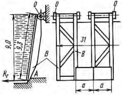 Стоечно-плоский затвор размером 9,3 × 31 м состоит из попарно соединенных стоек B, вращающихся вокруг оси O. Пространство между стойками при опущенном их положении закрывается набором плоских щитов шириной a = 1,8 м; для пропуска воды необходимое число щитов поднимается вверх по стойкам. Для случая, когда вся поверхность затвора закрыта щитами, определить следующие параметры: 1) полную силу P давления воды на затвор; 2) горизонтальную составляющую Rгреакции порога A; 3) наибольший изгибающий момент M для каждой из стоек (за исключением крайних).