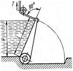 Клапанный затвор, имеющий плоскую поверхность размером L × B = 2,5 × 10 м, создает подпор воды H = 2,3 м. Определить: 1) суммарную силу натяжения тросов T, удерживающих затвор в заданном положении (без учета момента трения в опоре); 2) наибольший изгибающий момент M на затворе; 3) силу R, воспринимаемую цапфами опоры.