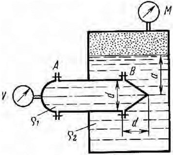 Горизонтальный цилиндрический сосуд диаметром d = 0,8 м с полусферической и конической тонкостенными крышками заполнен жидкостью плотностью ρ1. Правая половина цилиндра (с конической крышкой) вставлена в замкнутый резервуар и находится под уровнем другой жидкости (плотностью ρ2) на глубине a = 2 м. Определить горизонтальные Pг и вертикальные Pв составляющие сил давления жидкости на полусферическую и коническую крышки A и B, если показания вакуумметра V = 10 кПа, показания манометра M = 30 кПа и ρ1 = ρ2 = 1000 кг/м3. Показать в виде векторов горизонтальные и вертикальные составляющие сил давления жидкости на полусферу и конус. Как изменяться силы при ρ1 = 0,8 ρ2 = 800 кг/м3?