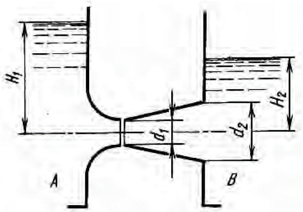 Вода перетекает из сосуда A из сосуд B через плавно сходящийся насадок с диаметром выходного сечения d1 = 100 мм и коэффициентом сопротивления ξ = 0,08 и приставленный к нему с небольшим зазором расходящийся конический насадок с выходным диаметром d2