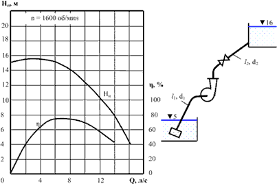 Центробежный насос с заданной при n = 1600 об/мин характеристикой перекачивает воду из резервуара с отметкой ?5 м в резервуар с отметкой ?16 м по трубопроводам размерами l1 = 10 м, d1 = 100 мм (?ζ1 = 2, λ1 = 0,025) и l2 = 30 м, d2 = 75 мм (?ζ2 = 12,