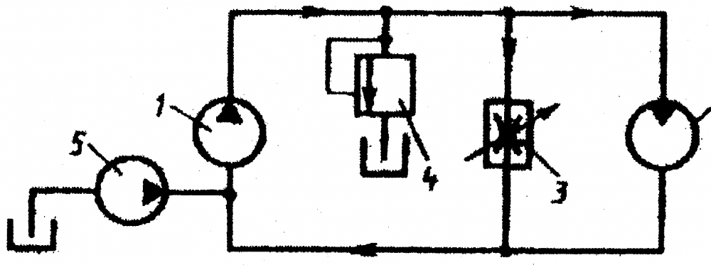 Объемный гидропривод вращательного движения с дроссельным регулированием состоит из двух гидромашин - насоса 1 и гидромотора 2, а также дросселя 3, предохранительного клапана 4 и вспомогательного насоса 5. Определить пределы изменения частоты вращени