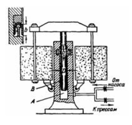 Задача (Куколевский И.И.) 1-19. При зарядке гидравлического аккумулятора насос подает воду в цилиндр А, поднимая плунжер В вместе с грузом вверх. При разрядке аккумулятора плунжер, скользя вниз, выдавливает своим весом воду из цилиндра в гидравлические прессы. Определить: