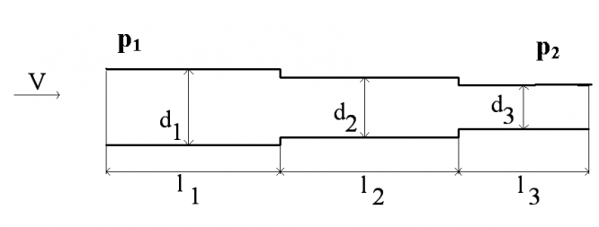 Главная » Учебные материалы » Механика жидкости и газа (МЖГ или Гидравлика) » Решения задач » Несколько классов/семестров » Вариант 10 » Определить, какое давление p2 будет в конце горизонтального составного трубопровода, если в начале избыточное давление равно p1. Трубы новые стальные, диаметры их соответственно d1=0,15 м, d2=0,125 м, d3=0,1 м, длины:l1=200 м, l2=150 м, l3=100 м. Р