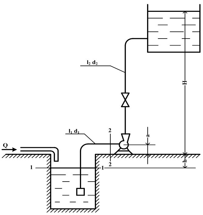 Определить установившийся уровень воды в нижнем резервуаре (если расход воды фиксирован и равен Q = 17 л/с), высоты всасывания (вакуумметрическую и допустимую геометрическую) на входе в насос, если насос качает воду из нижнего резервуара в верхний резервуар (см. рис.) с постоянным уровнем H по изношенным стальным трубопроводам размерами l1, d1 и l2, d2. Построить графики зависимости характеристик насоса и определить Hн, Hдопвак. Физические свойства воды необходимые для расчетов принять из справочной литературы. Коэффициенты местных сопротивлений на всасывающей линии ξ1 = 10, на линии подачи ξ2 = 6 (a = 1 м см. рис.). Характеристики насоса Hн=f(Q) и Hдопвак=f(Q), приведены в табл. 1. Исходные данные в табл. 2.