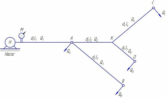 Главная » Учебные материалы » Механика жидкости и газа (МЖГ или Гидравлика) » Решения задач » Несколько классов/семестров » Тупиковая водопроводная система, представленная в плане на рис., состоит из насосной установки, подающей воду четырем потребителям – А, В, С, D – с расходами: QA=26 л/с; QВ=26 л/с; QС=13 л/с; QD=7 л/с. Рассчитать диаметры труб на каждом участке при