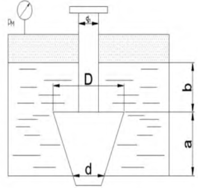 Главная » Учебные материалы » Механика жидкости и газа (МЖГ или Гидравлика) » Решения задач » Несколько классов/семестров » Отверстие в дне сосуда, содержащего масло плотность ρ=830 кг/м3, закрыто пробкой высотой а=0,1 м и диаметрами оснований D=100 мм и d=50 мм. Пробка укреплена на штоке диаметром d1=25 мм, уровень масла расположен выше пробки на b=0,05 м, а показание ма