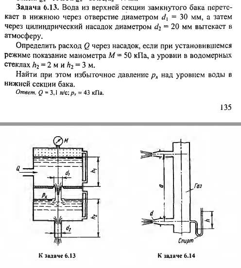 Вода из верхней секции замкнутого бака перетекает в нижнюю через отверстие диаметром d1 = 30 мм, а затем через цилиндрический насадок диаметром d2 = 20 мм вытекает в атмосферу.