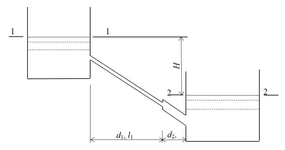 Из открытого резервуара, в котором поддерживается постоянный уровень жидкости, по трубопроводу, имеющему два участка, жидкость при температуре 20 0С течет в другой резервуар, расположенный ниже на высоту H. Определить расход жидкости. В расчетах прин