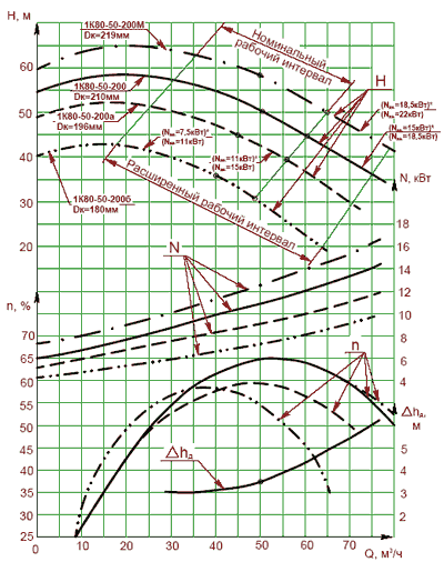 Центробежный консольный насос 1К80-50-200, характеристика которого приведена на рис. 1 работает на сеть трубопроводов. Высота подачи воды h. Характеристика сети выражается уравнением H = h + k · Q2 (где Q в м3/ч).
