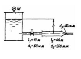 Задача (Куколевский И.И.) 9-11. Для горизонтального трубопровода, размеры которого указаны на схеме, определить расход Q при заданном давлении М = 4 атм и уровне воды в резервуаре Н = 5 м. Коэффициенты сопротивления вентиля С = 4 и сопла ? = 0,06 (сжатие струи на выходе из сопла отсутствует). Шероховатость каждого из участков трубопровода 1 мм (старые водопроводные трубы). Как изменится Q, если диаметр первого участка увеличить до d1 = 200 мм? Построить графики напоров по длине трубопровода.