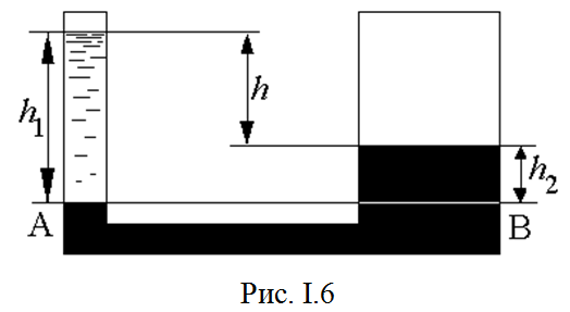 Определить плотность жидкости в открытых сообщающихся сосудах (рис. 1.6), если: а) ρ2 = 13600 кг/м3; h1 = 43,4 см; h2 = 39,4 см;