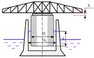 Поворотный пролет моста опирается на цилиндрический поплавок диаметром D = 3,4 м, плавающий в камере диаметром D1 = 3,6 м. Определить: 1) Погружение a поплавка в воду, если собственная масса пролета с поплавком равна m = 30 т. 2) Осадку h пролета при нагружении его внешней силой P = 100 кН.