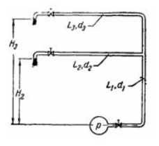 Задача (Куколевский И.И.) 10-23. Найти, как распределится расход Q1 = 10 л/сек воды (v = 0,01 см2/cек) между двумя стальными трубами (e=0,2 мм), длины которых L2=31,2 м_, L3= 71,2 м и диаметры d2 = d3 = 0,05 м, если высоты расположения их выходных сечений H2 = 4 м и Н3 = 10 м а суммарный коэффициент местных сопротивлений каждой трубы С = 5. Определить: 1) Какое давление р в магистральном трубопроводе обеспечит указанный суммарный расход, если размеры подводящей трубы L1=40 м, d1 = 0,075 м нее шероховатость 0,2 мм? 2) Как нужно изменить диаметры d2 и d3, чтобы при том же давлении в магистрали расходы в трубах стали равными Q2 =Q3 = 5 л/сек.