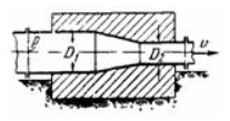 Задача (Куколевский И.И.) 13-2. Диаметр трубопровода на участке его заделки в опору меняется от D1 = 1,5 м до D2 = 1 м. Определить осевую силу, воспринимаемую опорой на переходном участке, при давлении перед опорой р = 0,4 МПа и расходе воды Q = 1,8 м3/с. Потерями в конусе пренебречь.
