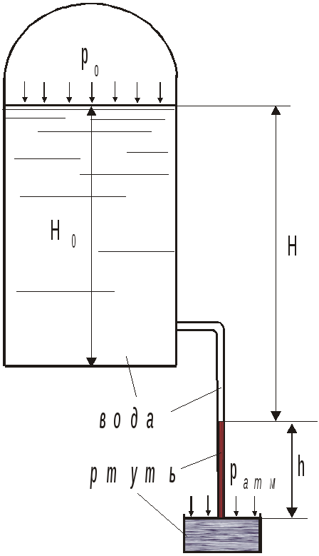 Главная » Учебные материалы » Механика жидкости и газа (МЖГ или Гидравлика) » Решения задач » Несколько классов/семестров » Определить величину абсолютного и вакуумметрического давлений на поверхности воды в резервуаре при Н=l,2м, если известна высота подъема ртути h=20см. Плотность ртути 13600 кг/м3, плотность воды 1000кг/м3, атмосферное давление принять равным 100 кПа.