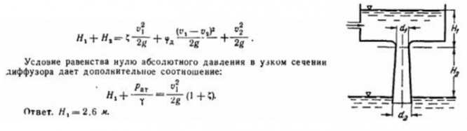 Задача (Куколевский И.И.) 6-9. Вода перетекает из верхнего резервуара в нижний по диффузору, диаметры которого d1 = 100 мм и d2 = 150 мм,. Коэффициент сопротивления входного участка ? = 0,06, а коэффициент потерь в диффузоре ?Д = 0,2. Определить, при каком уровне Н1 в верхнем резервуаре абсолютное давление в узком сечении диффузора станет равным нулю, если это сечение расположено над нижним уровнем на высоте H2 = 1,2 м. Атмосферное давление принять равным Рат= 98 кПа.