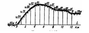 14-12. Из пункта А в пункт В необходимо перекачивать воду в количестве Q = 250 м3/ч по стальному трубопроводу диаметром d =150 мм и длиной l=14,0 км (шероховатость 0,2 мм) при указанном на схеме профиле трассы. Определить, сколько и в каких пунктах трассы необходимо установить одинаковые насосные станции, чтобы давление в трубах нигде не превышало 50 атм. Указание. Число насосных станций определяется делением потребного суммарного напора насосов НН на предельный по заданию напор одной станции. Места расположения станций определяются графически при помощи построения, показанного на схеме.