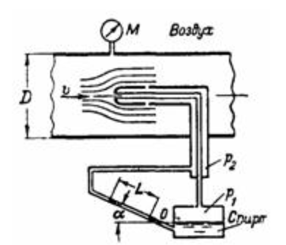 Задача (Куколевский И.И.) 7-36. Скоростная трубка, установленная вдоль оси воздухопровода диаметром D = 200 мм, дает на спиртовом микроманометре с наклонной шкалой показание L = 75 мм. Плотность спирта в манометре ρс = 800 кг/м3, наклон трубки манометра к горизонту sin α = 0,2. Давление воздуха в мерном сечении по манометру M = 40 кПа, температура t = 16 ℃. Атмосферное давление pат = 98 кПа. Определить массовый расход воздуха, приняв коэффициент трубки равным единице (перепад давлений (p1 – p2)/ρg воздуха в ветвях трубки равен скоростному напору v2/2g в мерной точку), а отношение средней скорости в трубке к измеряемой трубкой скорости на ее оси vср/v = 0,84.