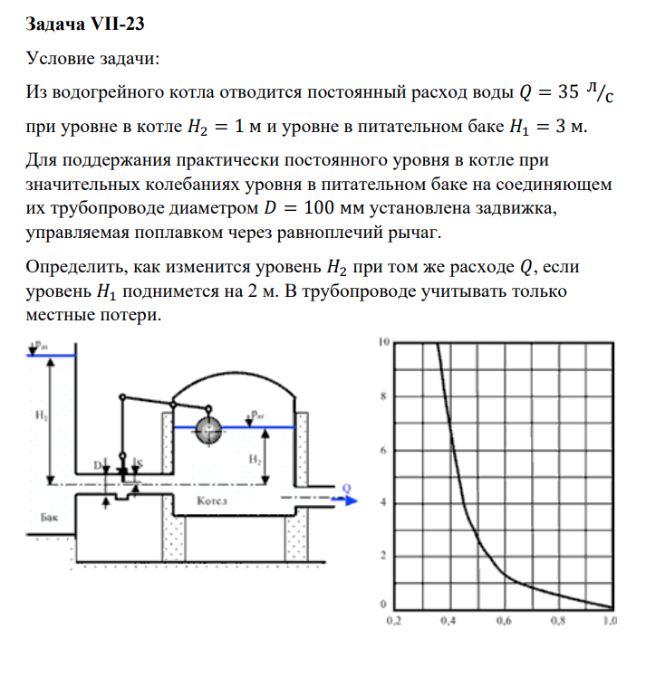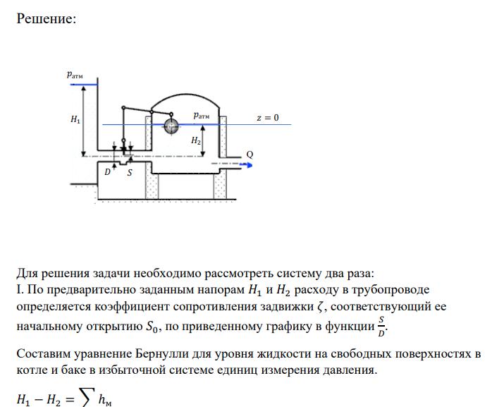 Задача (Куколевский И.И.) 7-23. Из водогрейного котла отводится постоянный расход воды Q = 35 л/сек при уровне в котле H2 = 1 м и уровне в питательном баке H1=3 м. Для поддержания уровня в котле при колебаниях уровня в питательном баке на соединяющем их трубопроводе диаметром D=100 мм установлена задвижка, управляемая поплавком через равноплечий рычаг. Определить, как изменится уровень Н2, если при том же расходе Q уровень H1 поднимется на 2 м.Указание. Предварительно по заданным напорам H1, и H2 и расходу в трубопроводе определяется коэффициент сопротивления задвижки, дающий ее начальное открытие S0 в соответствии с приведенным графиком. Затем при новом напоре H1, графически определяется такое повышение уровня в котле dH, при котором разность уровней в баке и котле и потерянный в трубопроводе напор (при новом открытии задвижки S=S0-?H) будут равны. В трубопроводе учитывать только местные потери