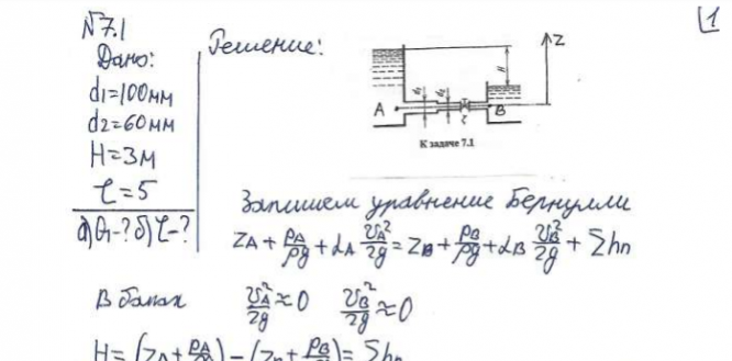Для студентов по предмету Механика жидкости и газа (МЖГ или Гидравлика)Задача 7-1Задача 7-1