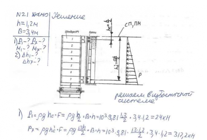 1) Определить силы давления воды P1 и P7 на первую и седьмую шандоры и величины максимальных изгибающих моментов М1 и М7, для этих шандор, считая катки расположенными на концах шандор;