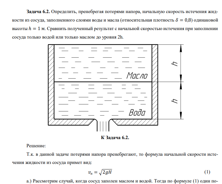Задача (Куколевский И.И.) 6-2. Определить, пренебрегая потерями, начальную скорость истечения жидкости из сосуда, заполненного слоями воды и масла (относительный вес ? = 0,8) одинаковой высоты h=1 м. Сравнить полученный результат с начальной скоростью истечения при заполнении сосуда только водой или только маслом до уровня 2h.Ответ. 5,94 м/сек, 6,26 м/сек