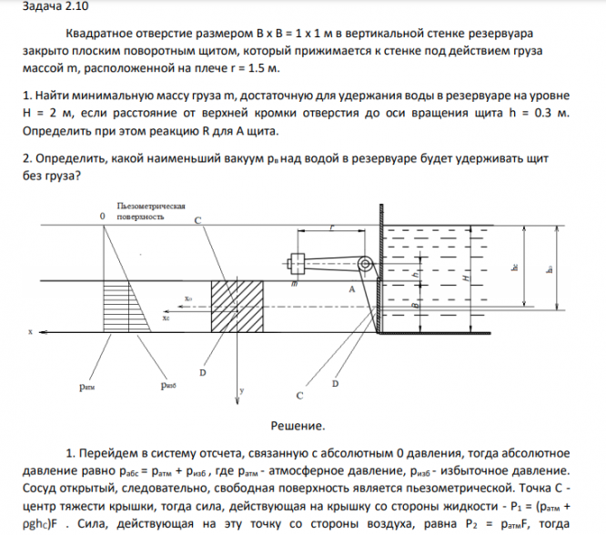 Задача (Куколевский И.И.) 2-10 . Квадратное отверстие размером В*В = 1*1 м в вертикальной стенке резервуара закрыто плоским щитом, который прижимается к стенке грузом О на плече r = 1,5 м. 1) Найти минимальную величину груза G, достаточную для удержания воды в резервуаре на уровне H=2 м, если расстояние от верхней кромки отверстия до оси вращения щита h = 0,3 м. Определить при этом реакцию R цапф А щита. 2) Определить, какой наименьший вакуум ри над водой в резервуаре будет удерживать щит без груза? Ответ. m = 857 кг, R= 16,9 кН, Рв = 15,7 кПа..