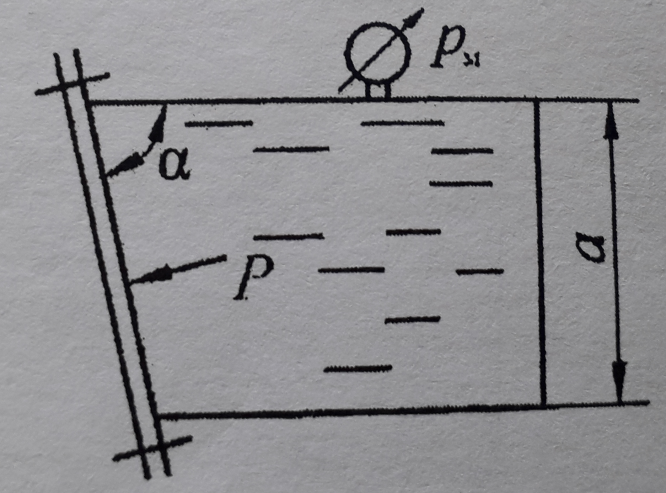 Определить силу, действующую на болты крышки бака, запоненного жидкостью плотностью ρ=1000кг/м3. Угол наклона крышки α=650. В сечении имеет форму квадрата со стороной a=2м. Манометр показывает давление рм=1,0МПа.