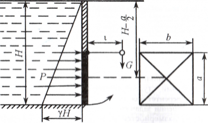 Требуется определить вес груза G на конце рычага длиной l, жестко прикрепленного к щиту, который позволил бы щиту открываться при достижении водой в резервуаре уровня Н.