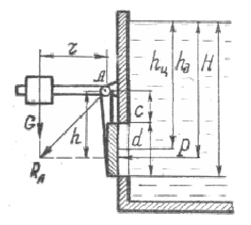 Главная » Учебные материалы » Механика жидкости и газа (МЖГ или Гидравлика) » Решения задач » Несколько классов/семестров » Круглое отверстие диаметром d=250мм закрыто плоским поворотным щитом, который прижат к стенке грузом G=1,5кН. Найти плечо r при уровне воды H=3,1м, если расстояние от верхней кромки отверстия до оси вращения щита С=0,3м. Найти реакцию R в цапфе щита