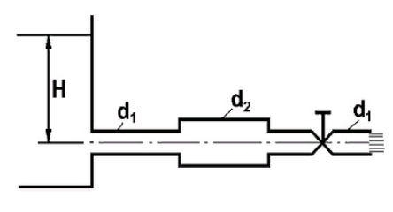 Главная » Учебные материалы » Механика жидкости и газа (МЖГ или Гидравлика) » Решения задач » Определить напор воды H, учитывая только местные сопротивления и построить пьезометрическую линию. Дано: Q = 80 л/с, d1 = 100 мм, d2 = 90 мм, ζвент = 4.