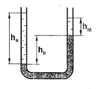 Выяснить разность уровней ртути hp в U – образной трубке, заполненной тремя жидкостями: водой, ртутью и маслом, hB = 70 см, hM = 9 см.