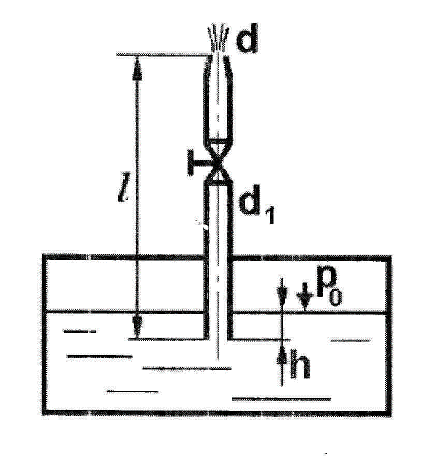 Из бака с постоянным уровнем вода вытекает в атмосферу через сходящийся насадок (d = 25 мм, d1 = 50 мм, l = 2,5 м, h = 0,5 м, давление p0 = 175 кПа). Определить высоту фонтана при полностью открытом вентиле. При расчете учесть все местные сопротивлен