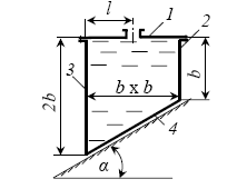 По наклоненной под углом α=45° к горизонту плоскости под действием силы тяжести скользит призматический сосуд, целиком заполненный водой. Сосуд закрыт крышкой с малым отверстием, расположенным на расстоянии l = 0.5 м от передней стенки. Масса сосуда m = 150 кг, размер b = 1м, коэффициент трения сосуда о плоскость скольжения f = 0.287. Найти величины сил давления на крышку 1, стенки 2 и 3, дно 4.