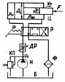 В ОГП поступательного движения (см. рис.) насос с рабочим объемом Vо имеет частоту вращения вала n и объемный КПД ηон = 0,96 при pн = 8,0МПа. Давление открытия переливного клапана pко = 5,0МПа, а при pк = 6,0МПа вся жидкость сливается через клапан. Гидроцилиндр с односторонним штоком имеет диаметр поршня Dп = 10d, диаметр штока Dш = 0,4*D0, шток нагружен силой F, КПД гидроцилиндра: 0,9. Гидролинии имеют диаметр d и длины: напорная lн = l, сливная lсл=0,5*l, эквивалентная длина каждого канала распределителя lэк = 200d. Другими местными сопротивлениями пренебречь. В системе масло Ж, при температуре Т. Определить скорость поршня vп и полезную мощность ОГП.