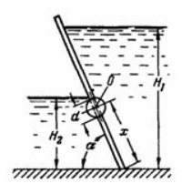 Задача (Куколевский И.И.) 2-5. Щитовой затвор должен автоматически опрокидываться для пропуска воды при уровне последней Н1>6 м. Щит поворачивается на цапфах О диаметром d =0,4 м, имеющих коэффициент трения f = 0,2. Ширина щита B = 8 м, его угол наклона а = 60°. Найти, на каком расстоянии х должна быть расположена ось попорота щита, если под щитом имеется постоянный уровень воды H2 = 3 м, и определить силу Р, воспринимаемую его опорами в момент опрокидывания.