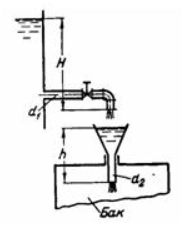 Задача (Куколевский И.И.) 7-4. Заполнение бака бензином происходит через воронку диаметром d2 = 50 мм, высотой h = 400 мм с коэффициентом сопротивления ? = 0,25. В воронку бензин заливается из резервуара с постоянным уровнем по короткой трубе диаметром d1 = 30 мм с краном и угольником, коэффициенты сопротивления которых соответственно ? = 8,5 и 0,8. Определить, какой наибольший напор Н можно иметь в резервуаре, чтобы воронка не переполнялась, и каков при этом расход бензина, поступающего в бак. Потери на трение в трубе не учитывать.