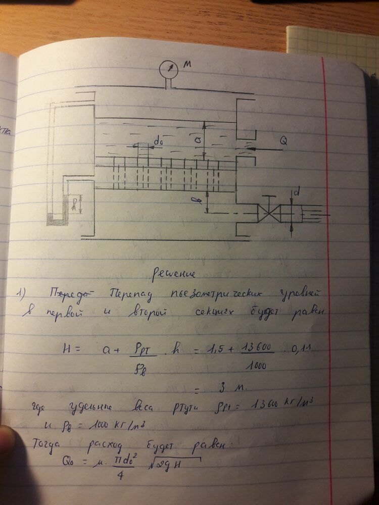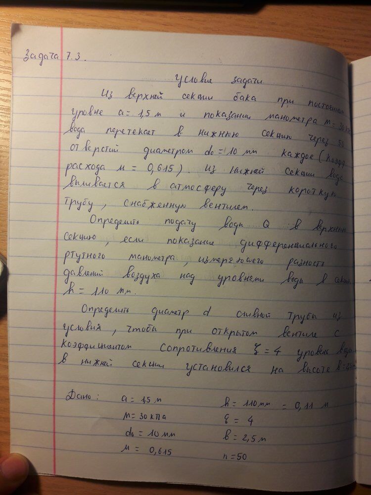Задача (Куколевский И.И.) 7-3. Из верхней секции бака при постоянном уровне а =1,5 м и показания манометра M = 30 кПа вода перетекает в нижнюю секцию через 50 отверстий диаметром d0=10 мм каждое. Из нижней секции вода выливается в атмосферу через короткую трубу, снабженную вентилем. Определить подачу воды Q в верхнюю секцию, если показание дифференциального ртутного манометра, измеряющего разность давлений воздуха над уровнями воды в секциях, равно h = 110 мм. Определить диаметр сливной трубы d из условия, чтобы при открытом вентиле с коэффициентом сопротивления 4,0 уровень воды в нижней секции установился на высоте b = 2,5 м.Ответ. Q= 18,6 л/с; d= 79 мм.