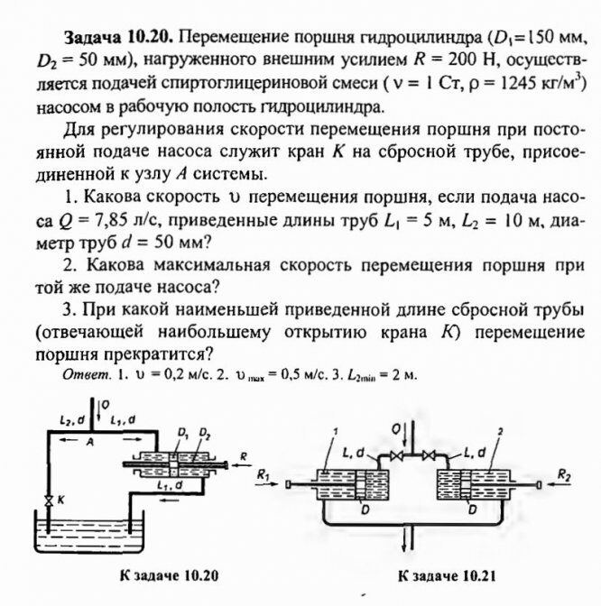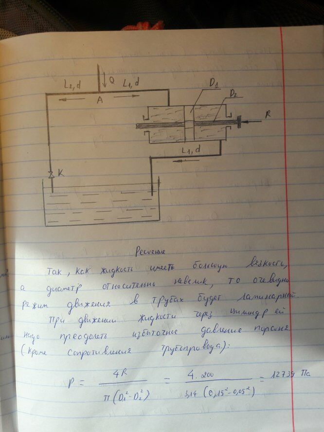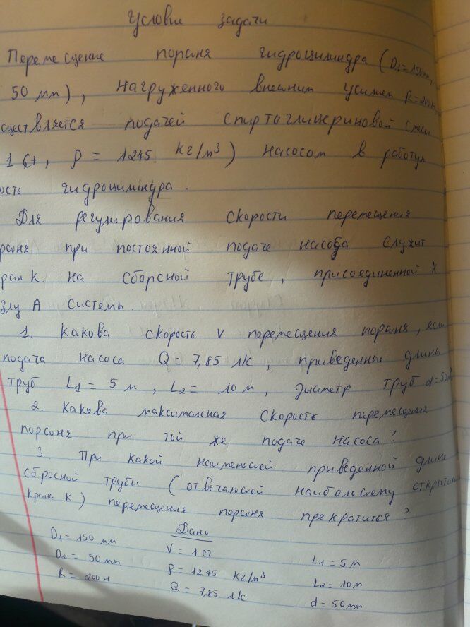 Задача (Куколевский И.И.) 10-20. Перемещение поршня гидроцилиндра (D1= 150 мм, D2 = 50 мм), нагруженного внешним усилием P=20 кГ, осуществляется подачей спирто-глицериновой смеси (v= 1 см2/сек, y=1220 кГ/м3) насосом в рабочую полость гидроцилиндра. Для регулирования скорости перемещения поршня при постоянной подаче насоса к узловой точке А системы присоединена сбросная труба с краном С. Определить: 1) Какова скорость V перемещения поршня, если подача насоса Q = 7,85 л/сек, приведенные длины труб L1 = 5 м, L2=10 м, диаметр труб
