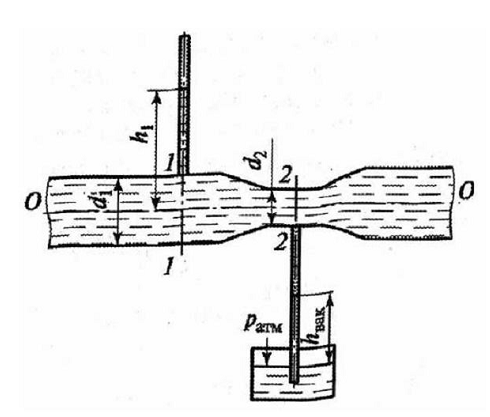Определить на какую высоту hвак поднимется вода в трубке, один конец которой присоединен к суженной части трубы, а другой коней опущен в воду. Расход воды в трубе Q=0,025 м3/с, избыточное давление р1=49·103 Па, диаметры d1=100 мм и d2=50 мм.
