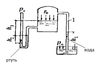 Чему равно показание манометра h2 и высота подъема уровня воды h1 , если давление на поверхности в резервуаре p0 и показание ртутного манометра h3.