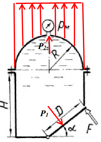 Бак прямоугольного сечения высотой H =1,20м имеет сверху полусферическую крышку радиусом R=0,5м, а снизу – наклонную плоскую крышку диаметром D=0,4 с осью вращения О. Бак полностью заполнен маслом (ρ = 820 кг/м3) под давлением pм=0,06МПа. α=600