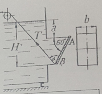 Определить, какое усилие Т следует приложить к тросу для открытия прямоугольного щита АВ шириной b, если затвор удерживает напор воды, равный Н, а уровень воды над верхней кромкой затвора составляет а. Угол наклона затвора равен 600. Затвор может вра